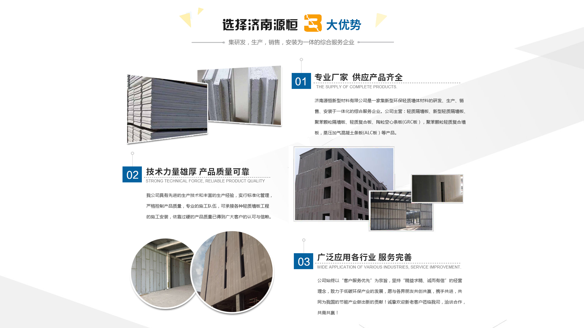 濟(jì)南源恒新型材料有限公司坐落于美麗的泉城濟(jì)南,是集新型環(huán)保輕質(zhì)墻體材料的研發(fā)、生產(chǎn)、銷售、安裝于一體化的綜合服務(wù)企業(yè)。我公司具有的生產(chǎn)技術(shù)和豐富的生產(chǎn)經(jīng)驗(yàn),為您提供輕質(zhì)隔墻板、新型輕質(zhì)隔墻板、聚苯顆粒隔墻板、輕質(zhì)復(fù)合板、陶粒空心條板(GRC板),聚苯顆粒輕質(zhì)復(fù)合墻板,蒸壓加氣混凝土條板(ALC板)等產(chǎn)品,本公司有專的施工隊伍,可承接各種輕質(zhì)墻板工程的施工安裝。輕質(zhì)隔墻板是國家推廣使用的新型輕質(zhì)、綠色無害建材,是墻改節(jié)能政策大力扶持的環(huán)保節(jié)能產(chǎn)品,是發(fā)達(dá)國家普遍采用的新型墻體材料。濟(jì)南源恒新型材料有限公司實(shí)行標(biāo)準(zhǔn)化管理,嚴(yán)格控制產(chǎn)品質(zhì)量,依靠過硬的產(chǎn)品質(zhì)量已得到廣大客戶的認(rèn)可與信賴。公司產(chǎn)品遍布各大城市,與國內(nèi)多家客戶建立了良好的合作關(guān)系。公司始終以“客戶服務(wù)優(yōu)先”為宗旨,堅持“精益求精、誠而有信”的經(jīng)營理念,致力于低碳環(huán)保產(chǎn)業(yè)的發(fā)展,愿與各界朋友共創(chuàng)共贏,攜手共進(jìn),共同為我國的節(jié)能產(chǎn)業(yè)做出新的...